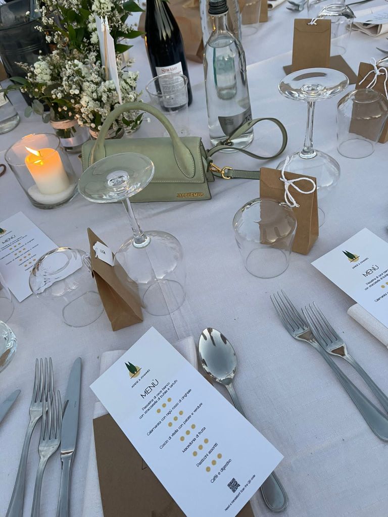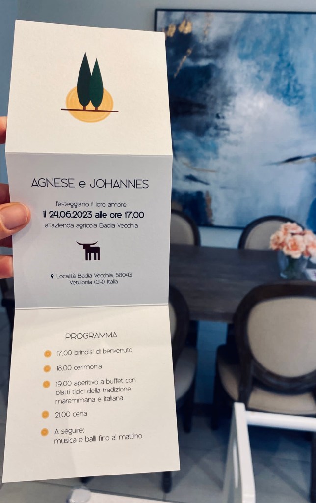 A gennaio 2023 mandammo gli inviti. Come stamperia scegliemmo Marta & Paul, sita nel quartiere di Friedrichshain, a Berlino. La parte grafica dell’intero evento fu invece curata dalla nostra cara amica, e bravissima graphic designer, Maie Escorial. Negli inviti mettemmo anche il link al nostro sito, che aveva come obiettivo principale quello di raccontare qualcosa in più su Badia Vecchia. Era una location così fuori dai classici schemi, che necessitava assolutamente una piccola introduzione. E poi volevamo anche dare qualche consiglio su cosa fare e vedere nella bella Toscana, siccome nessuno dei nostri invitati veniva da lì.