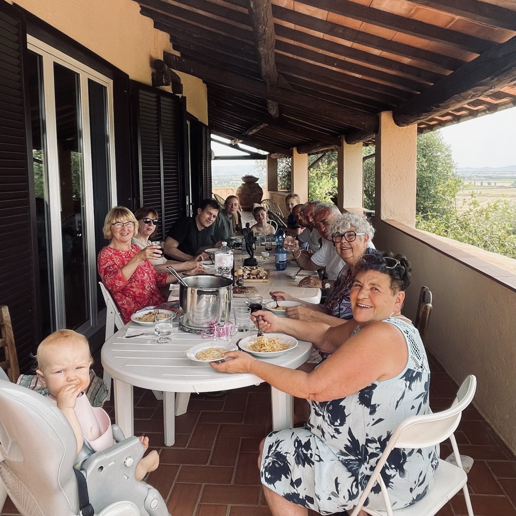 Il 20 giugno, compleanno di mia mamma, partivamo alla volta della Toscana. Io, Johannes, Allegra, tutti e quattro i nonni (e relativi partner), la cugina di Johannes Mareike con Niklas e i figli Julian e Philip, che arrivavano per l’occasione perfino da San Francisco (e che io avevo il piacere di conoscere per la prima volta), la zia di Johannes Gerti e una cara amica di mia mamma, Delia. Qualche giorno dopo ci avrebbe raggiunti anche un’altra cugina di Johannes, Lisa, con il fidanzato Valentin.