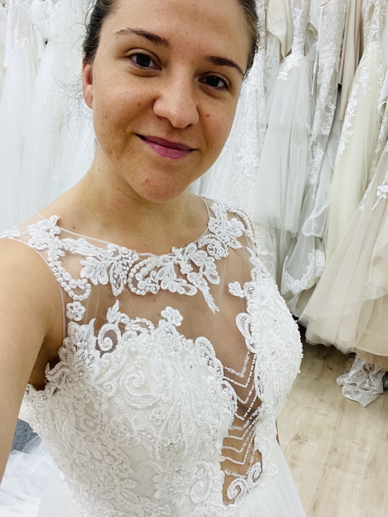 Il 10 ottobre 2022 presi appuntamento da Melissa Trentin, che da qualche anno ha aperto un atelier di abiti da sposa nel mio paese di origine, Cittiglio, in provincia di Varese. Anche in questo caso non ero molto fiduciosa: a Cittiglio non abbiamo neanche un cinema o una libreria, figuriamoci un negozio dove avrei potuto trovare l’abito da sposa dei miei sogni. Anche la mia forma fisica non era proprio al top: avevo partorito da poco più di due mesi e non mi vedevo bella. Però pensai che quel giorno avrei dovuto trovare il mio abito. Non avevo il tempo, e le forze, per girare per negozi di abiti da sposa, con Allegra che voleva attaccarsi al seno in ogni momento. Ne provai tre. Solo uno però mi faceva sentire speciale, mi illuminava il viso. Dire che ne fossi pienamente convinta sarebbe dire una bugia, ma decisi comunque di prenderlo.