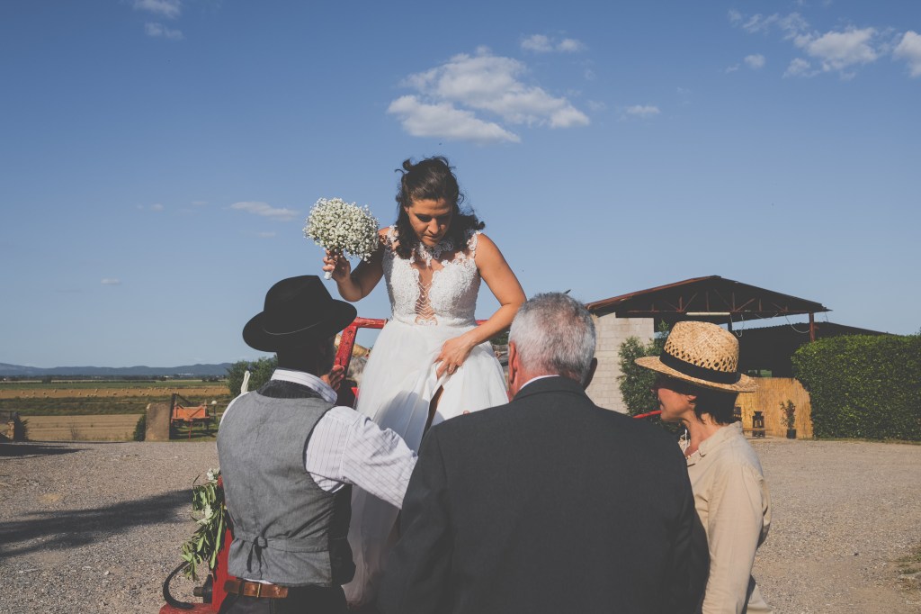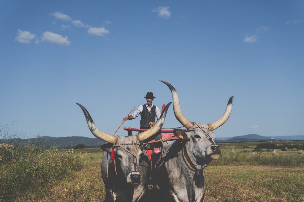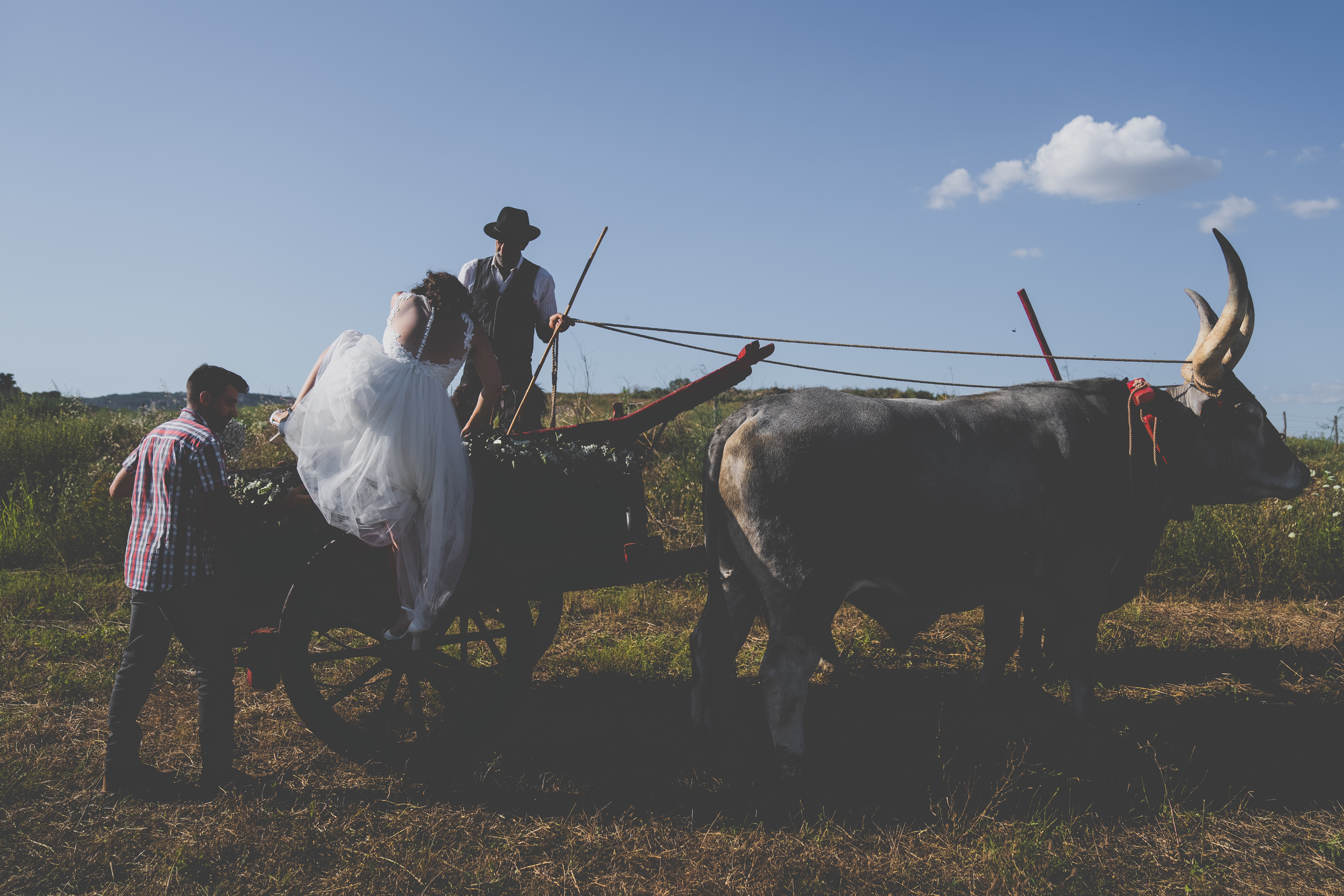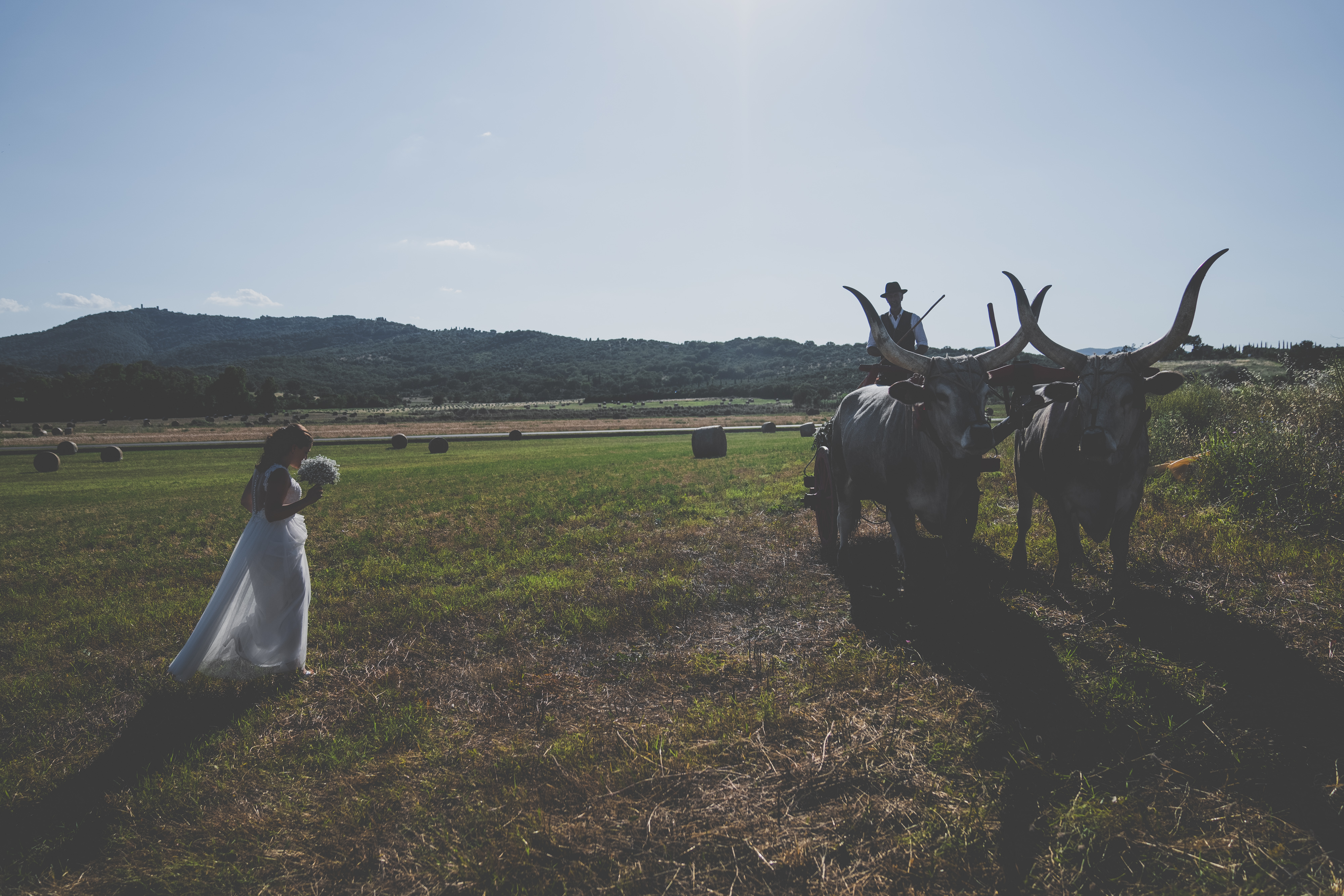 Ed eccolo lì che mi aspettava, il mio caro amico Loriano, nel suo miglior outfit da buttero, con due buoi maremmani e quel carro rosso, dove – ad oggi ancora non so come ho fatto – sarei salita per raggiungere la cerimonia. Ma prima dovevo essere sicura che mia mamma fosse arrivata a destinazione. Dopo qualche minuto mi dissero di sì. Mi aspettavano tutti, potevamo partire. Cominciai a piangere.