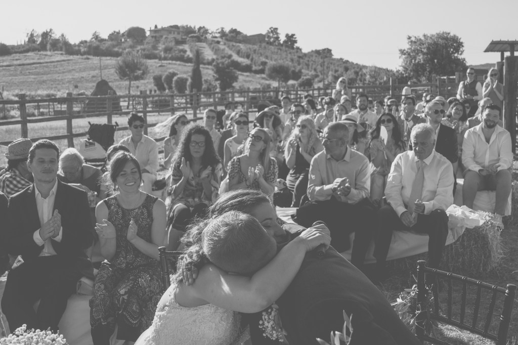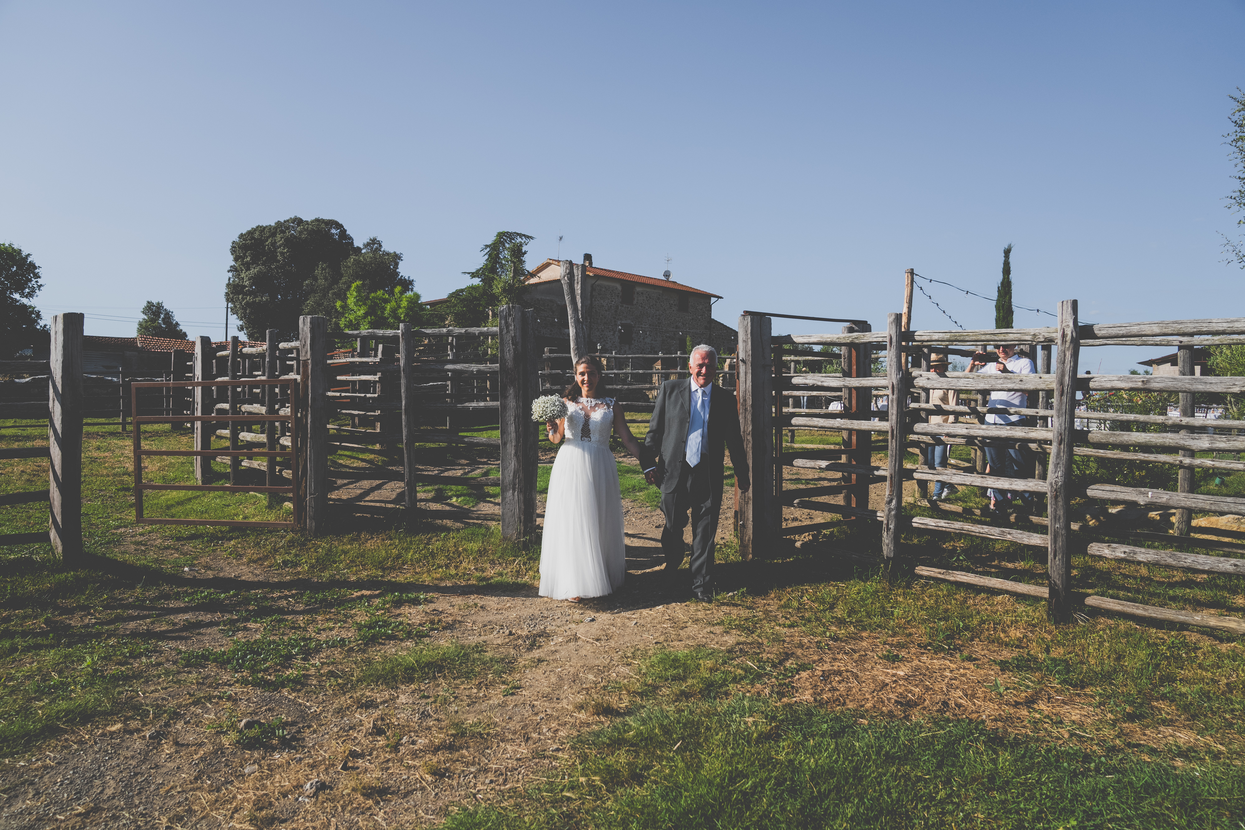 Credo che questo sia in assoluto il momento che più di tutti spero di non dimenticare mai. Vorrei poter custodire ogni sensazione, ogni ricordo di quell’incredibile viaggio su quel carro. Procedevamo lenti in un bellissimo campo, ricoperto di balle di fieno che Loriano aveva fatto per noi, con quella luce magica che iniziava ad arrivare. Ricordo che a un certo punto, dietro le staccionate di legno, cominciai a vedere i nostri ospiti. Erano così piccoli, non potevo riconoscerli. Ma sapevo che erano tutte persone che mi volevano bene e questo bastava per riempirmi di un amore immenso.