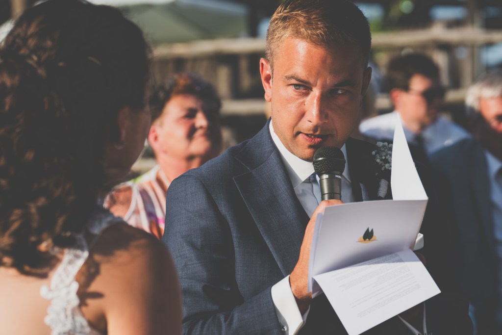 Descrivere nel dettaglio quanto bello fosse l’allestimento della cerimonia avrebbe poco senso, le foto qui sotto parlano da sole. So solo che era come se stessi sognando ad occhi aperti. Sebbene io amassi alla follia quel luogo, e sapevo avesse qualcosa di speciale altrimenti non l’avremmo scelto come location per il nostro matrimonio, il risultato sorprese anche me. Era una cerimonia romantica, dolce, emozionante, eravamo avvolti dalla luce del tramonto, da un’arietta che sembrava bisbigliarci dolci parole e dall’affetto delle persone a noi più care, che si sentiva, si vedeva.