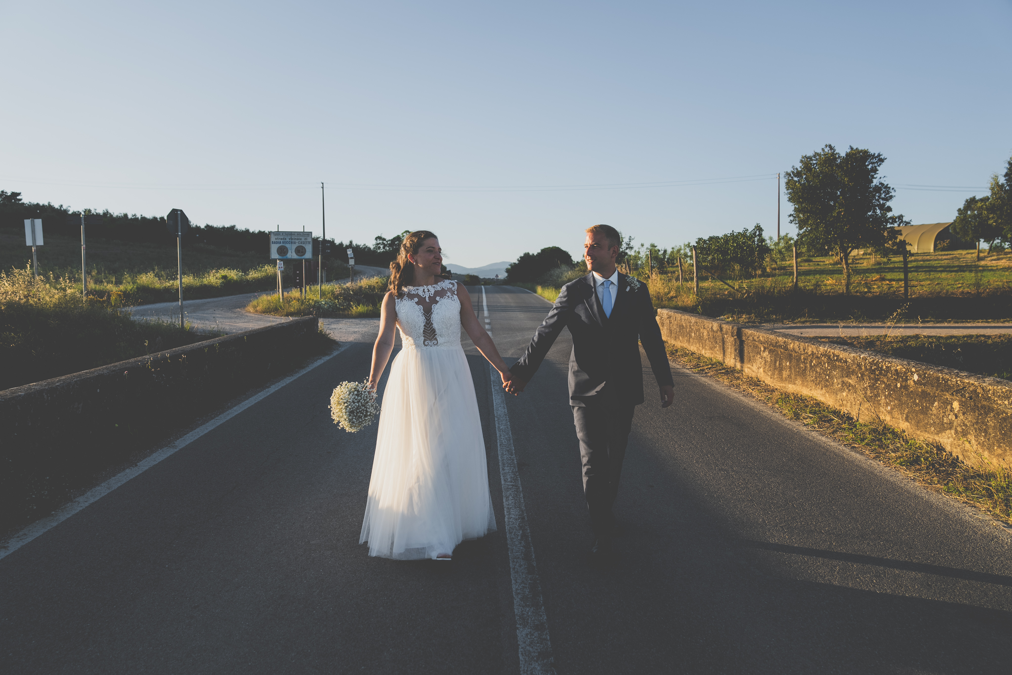 Dopo la cerimonia io e Johannes andammo a fare le foto di coppia, nel campo appena sotto, quello dovero passata con il carro. Che emozione dirsi subito quanto fossimo felici. Non riuscivamo a capacitarci di quanto bello fosse tutto: Maria e le sue collaboratrici erano riuscite a trasformare la semplice fattoria di Badia Vecchia in qualcos’altro, pur lasciandone intatta, anzi esaltandone, la sua autenticità. Sembrava di stare all’interno di un film, o di un magazine di moda da tanto curato era l’allestimento. Erano riuscite a rendere una location che non è da matrimonio (fino a prova contraria siamo stati e rimaniamo i primi sposi), LA location da matrimonio. La realtà è andata oltre ogni nostra fantasia più bella. Ed è quello che ancora oggi – e sicuro nei mesi e anni a venire – continuerà ad emozionarci di più.