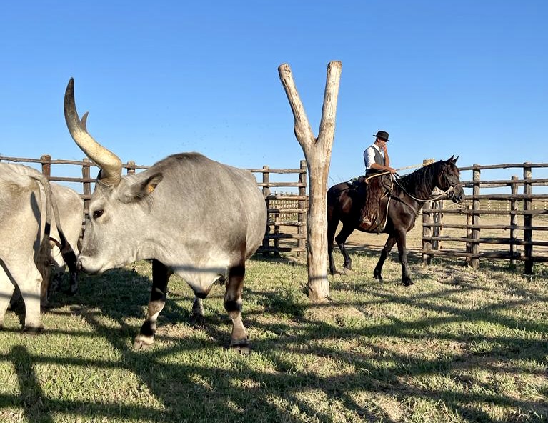 Il giorno dopo andammo da Loriano a recuperare delle cose e lui fu così carino da regalarci un ricordo di quel giorno: su un tronco di ulivo era stata intagliata la data 24 giugno 2023 e il nome Badia Vecchia e disegnati i due buoi che mi avevano accompagnata alla cerimonia, un cappello da buttero da donna e l’immancabile cavallo. Il tronco poggia su un giogo, dove sta appeso un uncino, il tipico strumento da buttero, una sorta di terzo braccio, con cui fare diverse attività senza dover scendere da cavallo.