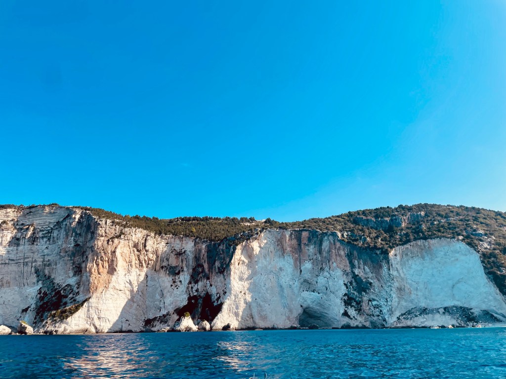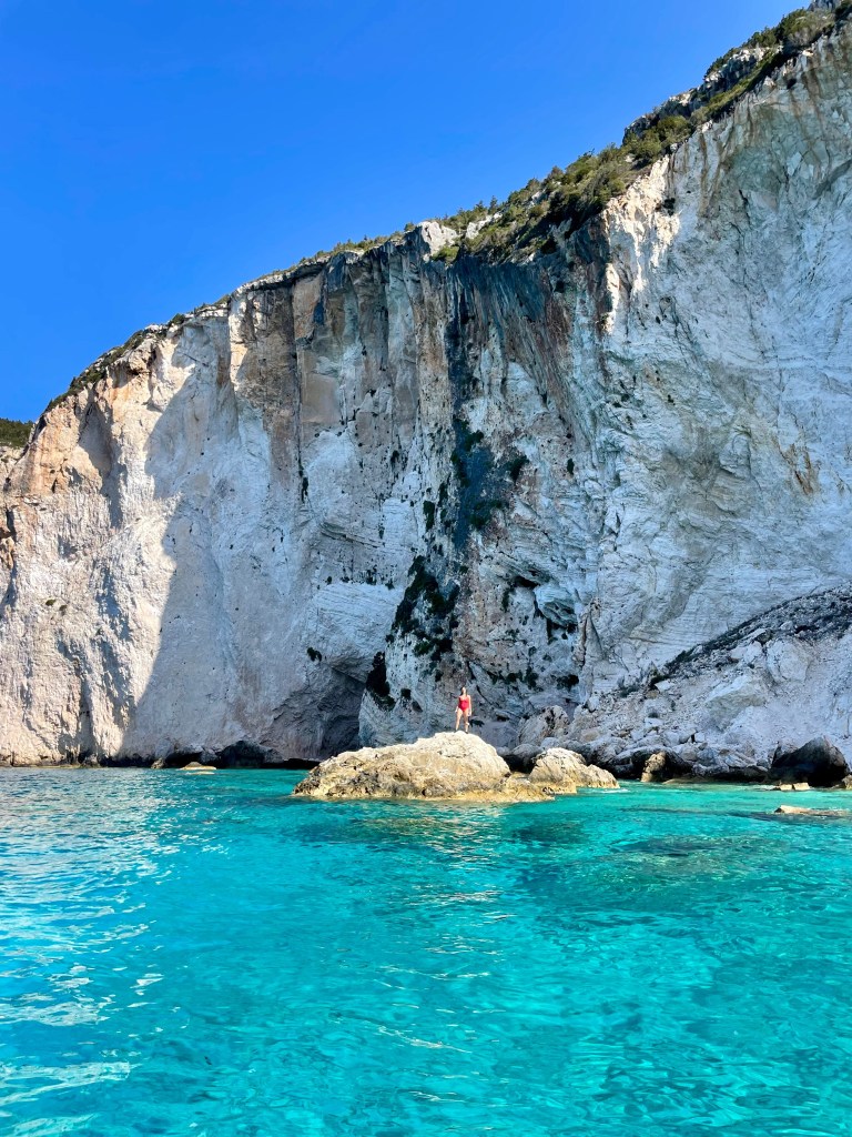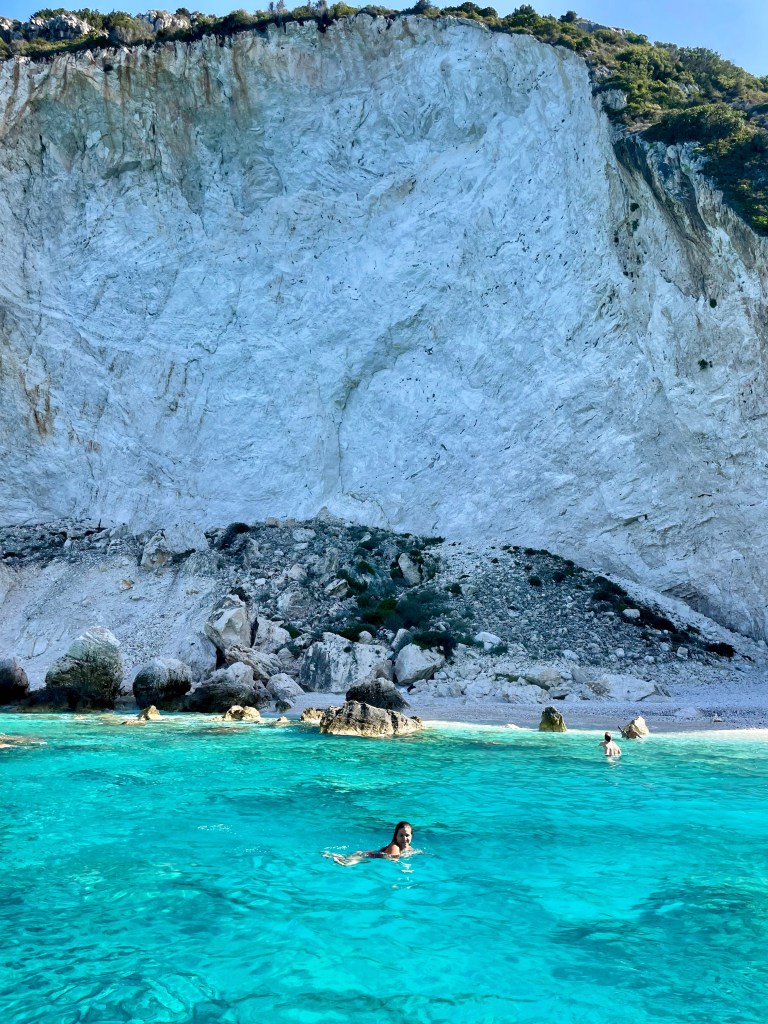 Con gli occhi pieni di meraviglia abbiamo ammirato l’arco di Tripitos (si può raggiungere anche via terra e camminarci sopra, solo se non soffrite di vertigini però!), tante grotte e cave spettacolari e poi siamo arrivati in quella che è sicuramente una delle spiagge più belle viste in vita mia: Erimitis Beach. Pareti bianche rocciose altissime, acqua trasparente azzurro Ionio, la libertà di poter nuotare fino a uno scoglio e da lì tuffarsi, con le bimbe che dormivano tranquillamente sul barchino, perché il dondolio delle onde le aveva nel frattempo addormentate. Io chiamavo mio marito “capitano” ed ero grata di essermi follemente innamorata della Grecia qualche anno fa e di sceglierla con grande gioia ogni anno per i nostri viaggi estivi.